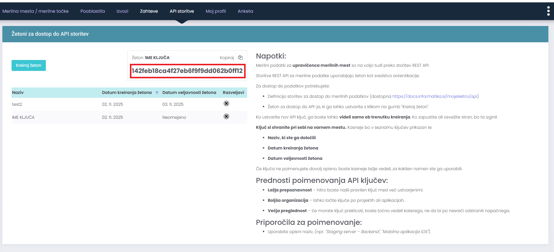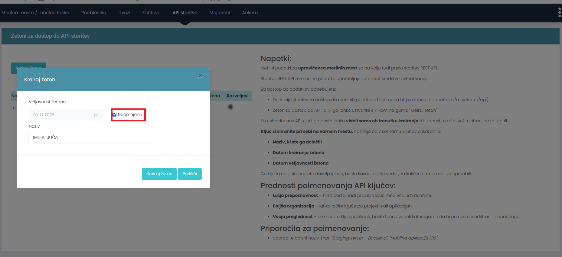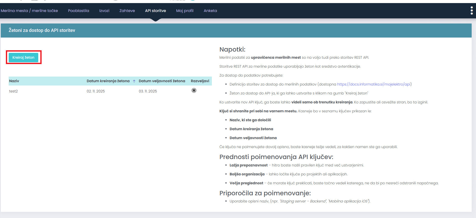 Za dostop do podatkov MojElektro je potrebno ustvariti API žeton.