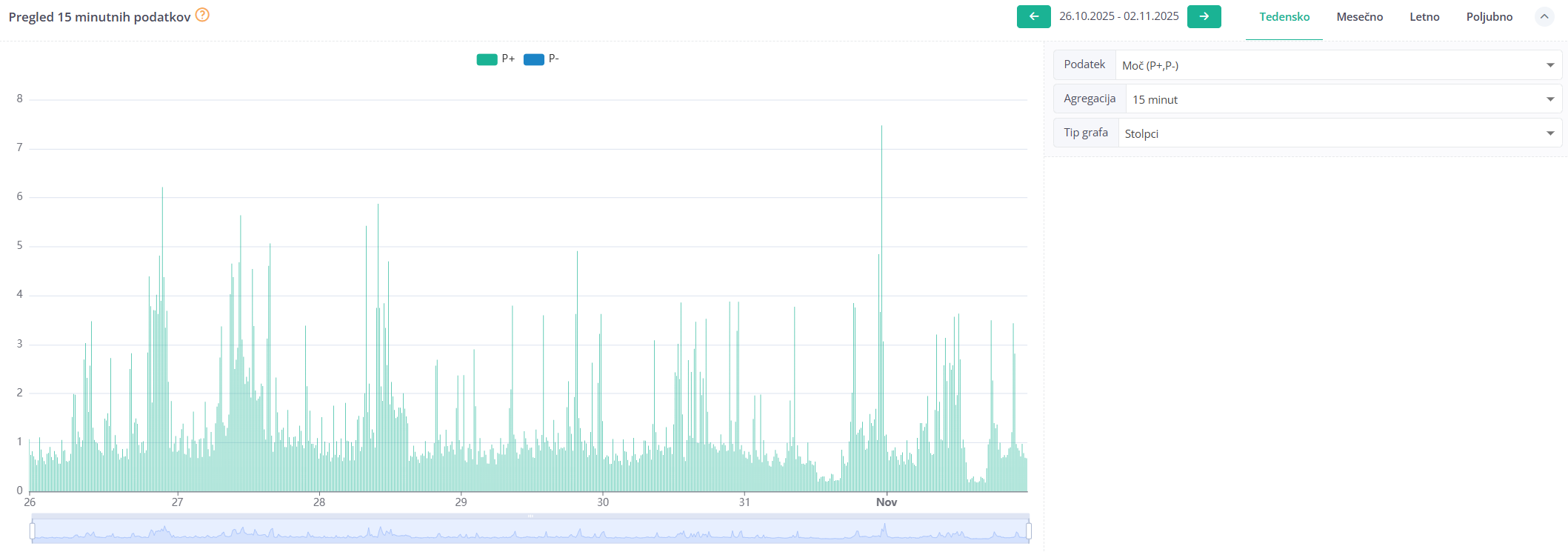 Grafični prikazi in analize – spremljanje trendov skozi dneve, mesece in leta.