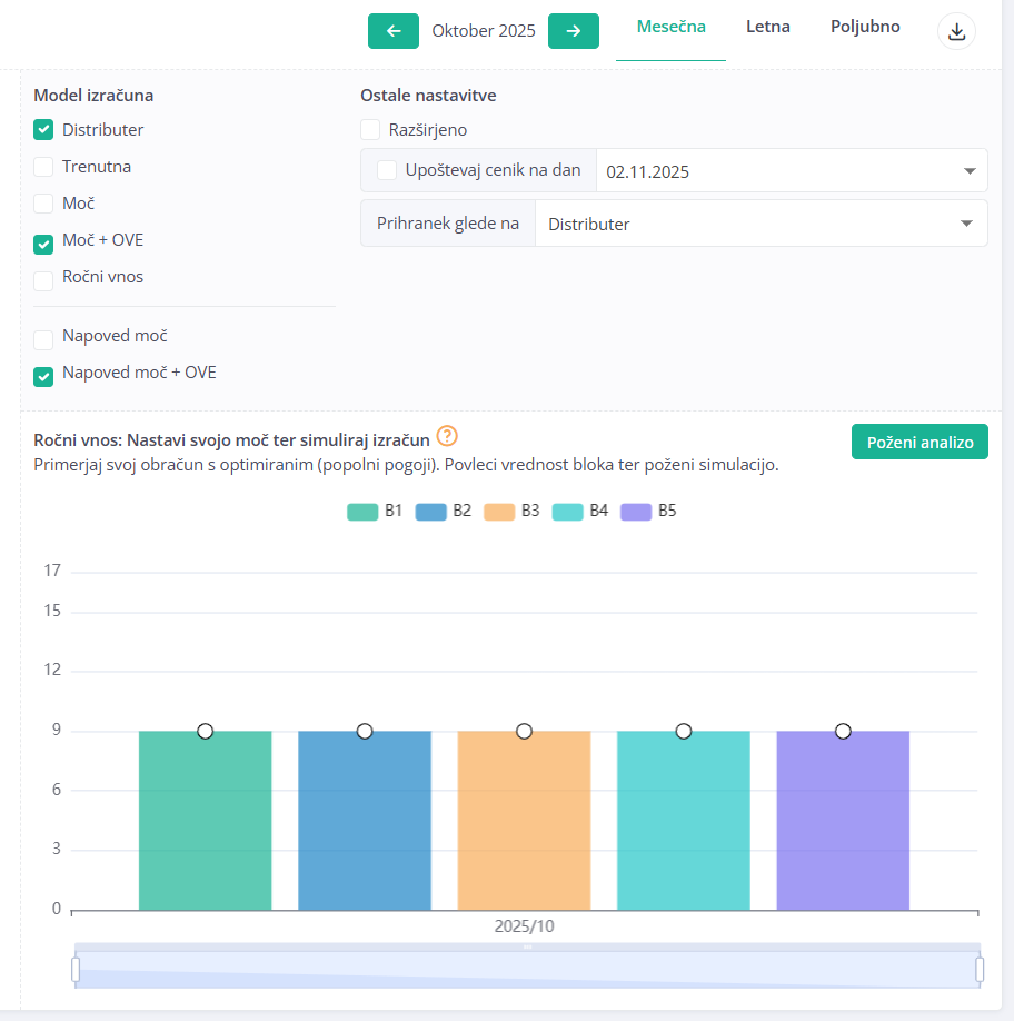 Model omogoča izračun potencialnega prihranka ali izgube glede na moč, ki bi vam jo določil distributer.