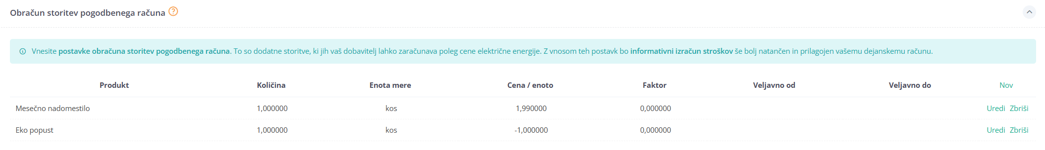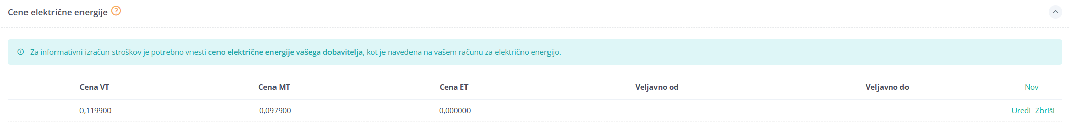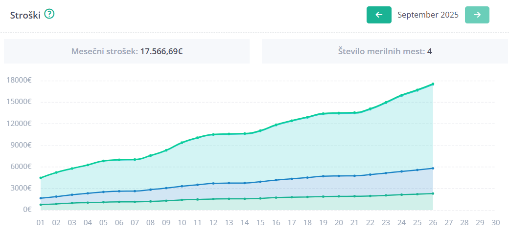 Samodejni izračun stroškov – račun se sproti izračunava glede na vašo dejansko porabo. V procesu vnosa meilnega mesta vnesete cene dobave električne energije iz vašega računa za dobavljeno električno energijo.