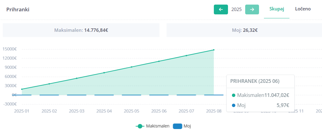 Preglejte, koliko lahko prihranite z optimizacijo dogovorjene obračunske moči. Zeleni stolpec prikazuje maksimalni možni prihranek, modri vaš dejanski prihranek. Graf prikazuje kumulativni trend skozi mesece, tako da enostavno vidite, kje se nahajate glede na potencialni prihranek. Če dogovorjene moči niste spreminjali, tudi prihrankov ne boste videli. Vsako spreminjanje dogovorjene obračunske moči je potrebno tehtno preračunati.